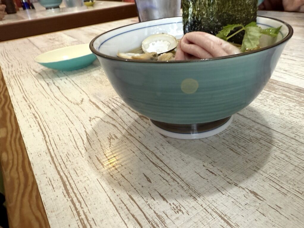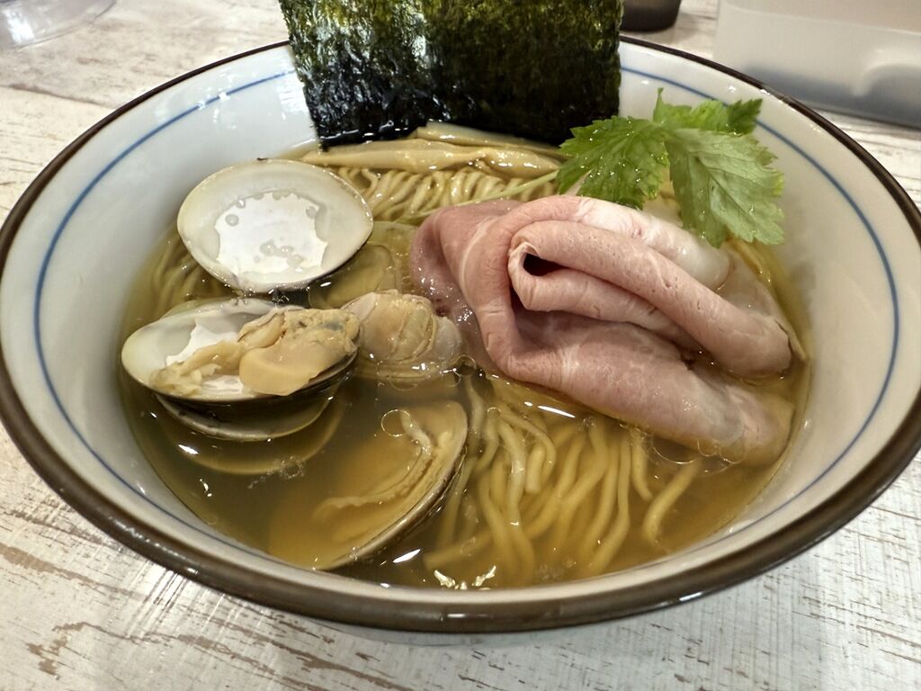 具は低温調理のチャーシュー、殻付き蛤、穂先めんま、三つ葉、海苔。低温調理のチャーシューはレアすぎたり味がしないお店もありますが、四つ葉のはしっかり火が通っていて味が沁みてて美味。