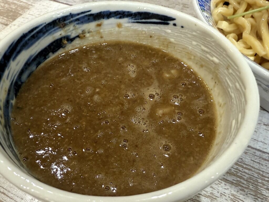 大量の食材が溶け出した濃厚なつけ汁に金笛醤油のコクとうま味が効いています。強靭なコシのある自家製麺も秀逸。