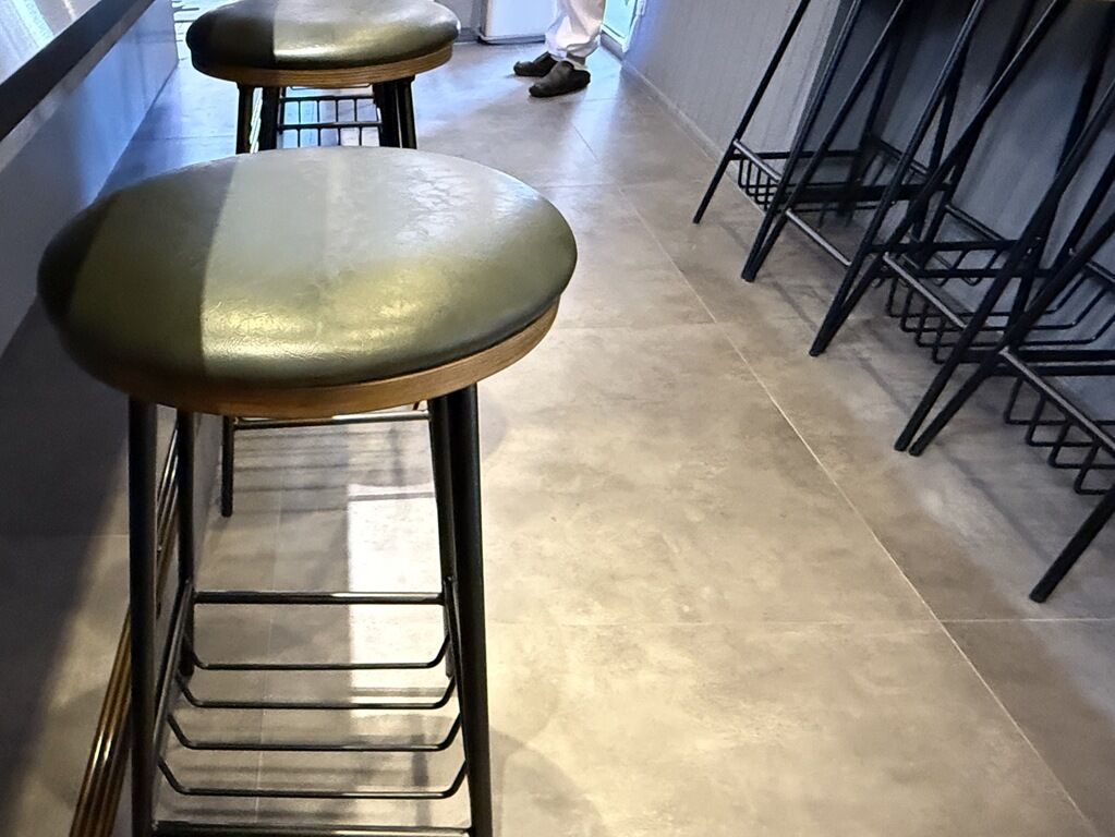 店内は厨房を囲むL字型カウンター12席(8・4)、4人卓x4。椅子下に荷物が入れられる様にカゴ状なっています。