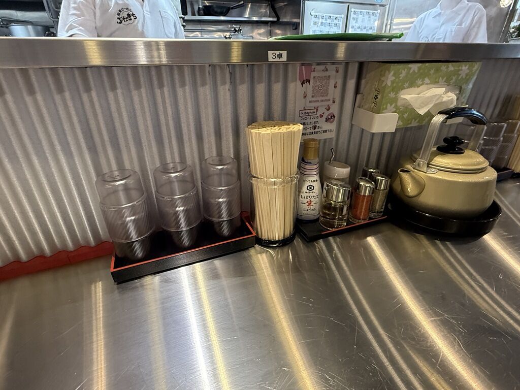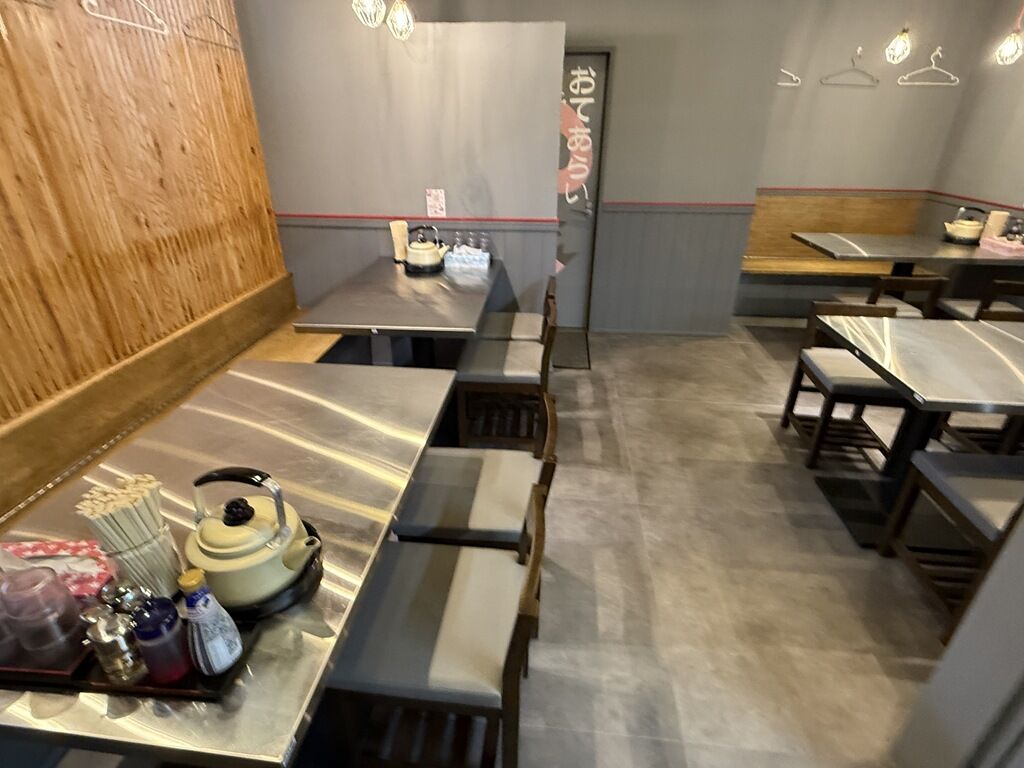 BGMはJーPOP。箸は割り箸。卓上調味料はキッコーマンしぼりたて生しょうゆ、ラー油、酢、一味唐辛子、ブラックペッパー。