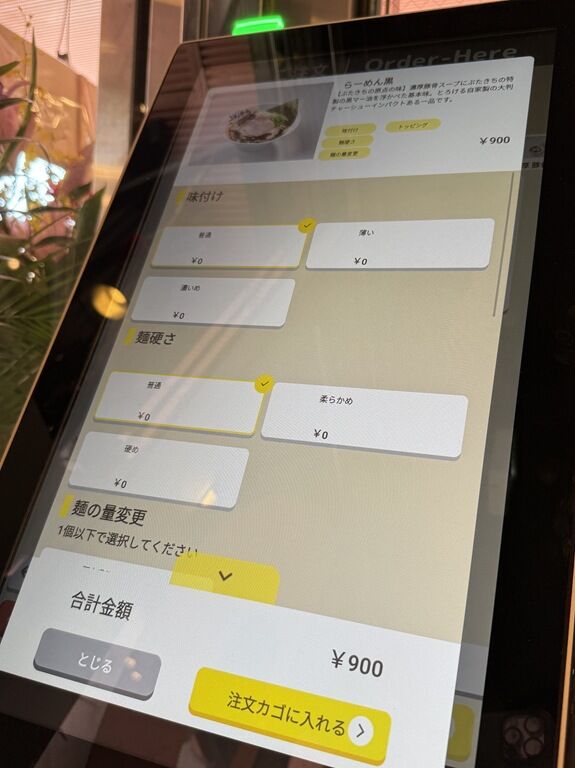 味の濃さ・麺の固さも券売機で指定する方式。一部のタッチパネル券売機には、明示的に普通を選んでいかないと先に進めない設定がたまにありますが、こちらはデフォで普通が選択されていて、そのまま次へを押していけば良くストレスフリー。