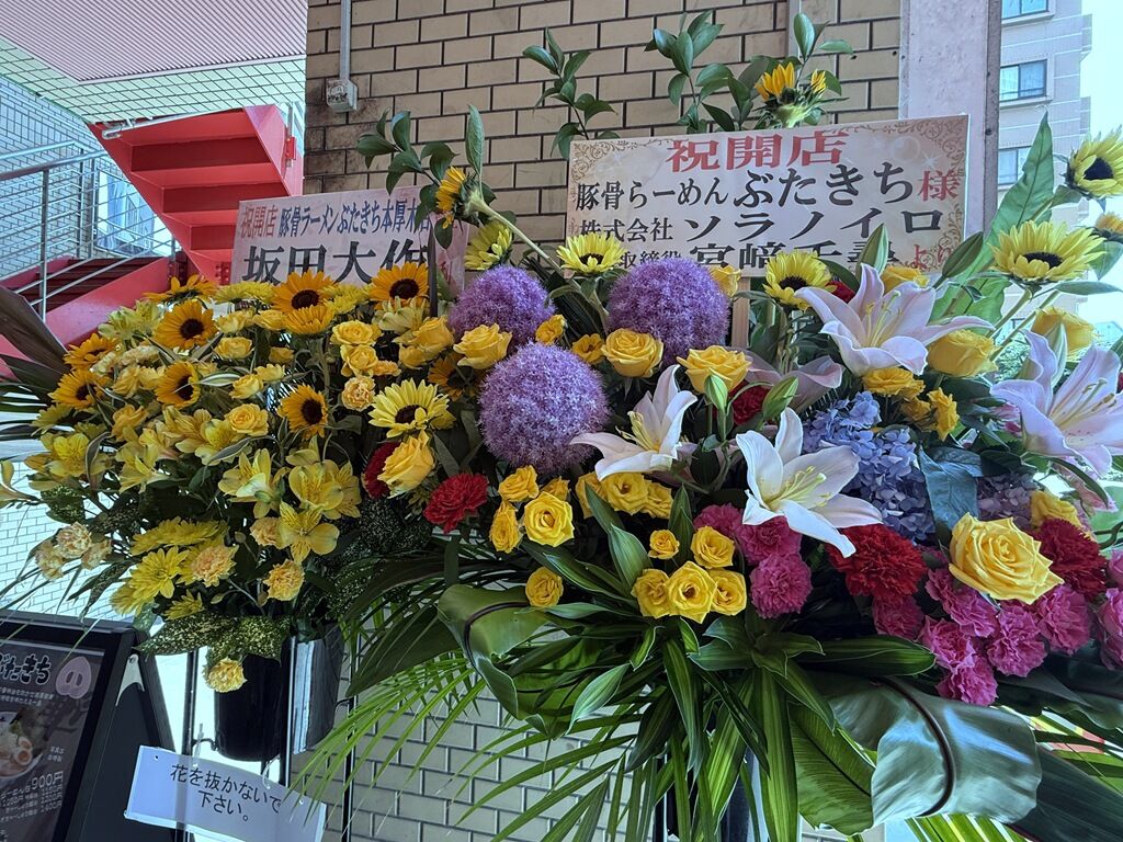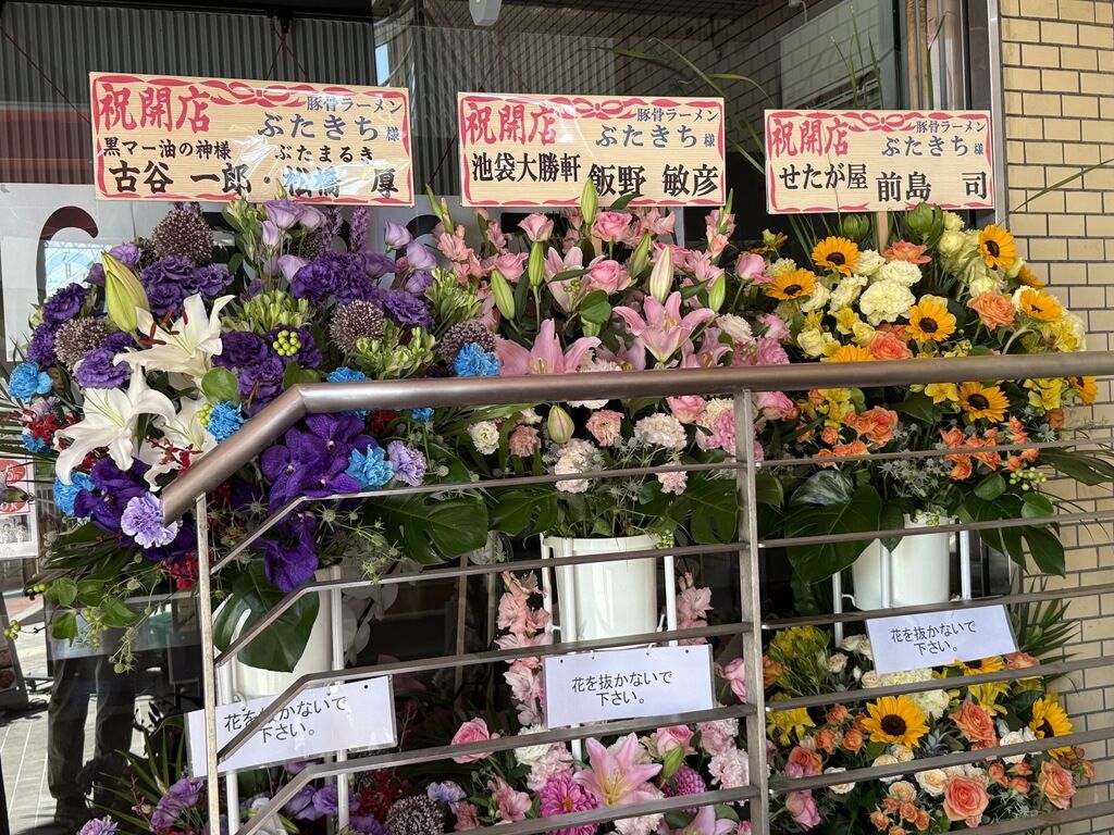 店頭開店祝花は、黒マー油の神様古谷さん、ぶたまるき松橋さん、池袋大勝軒飯野さん、せたが屋前島さん、ソラノイロ宮崎さん、他から。