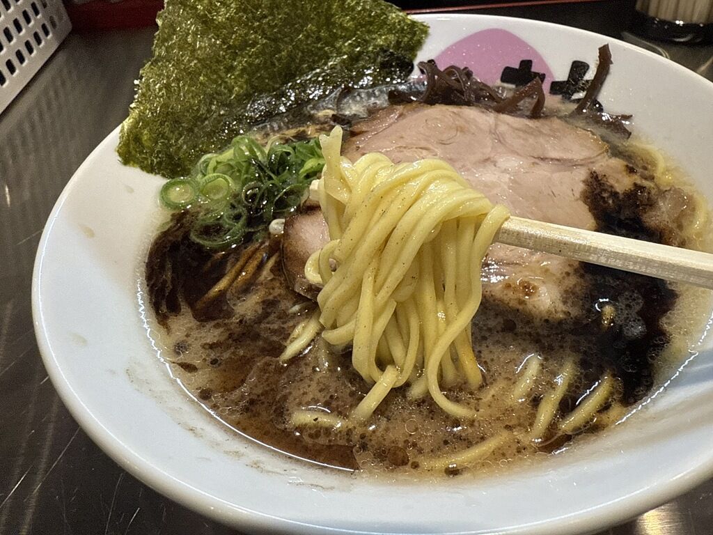 麺は麺の麻生製のストレート中太タイプ。熊本ラーメンらしく博多ラーメンよりは少し番手の小さなタイプ。普通の固さでちょうどいいツルシコ加減。