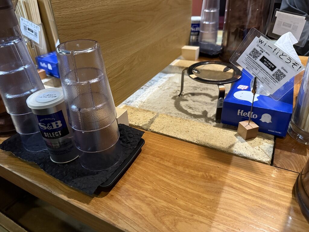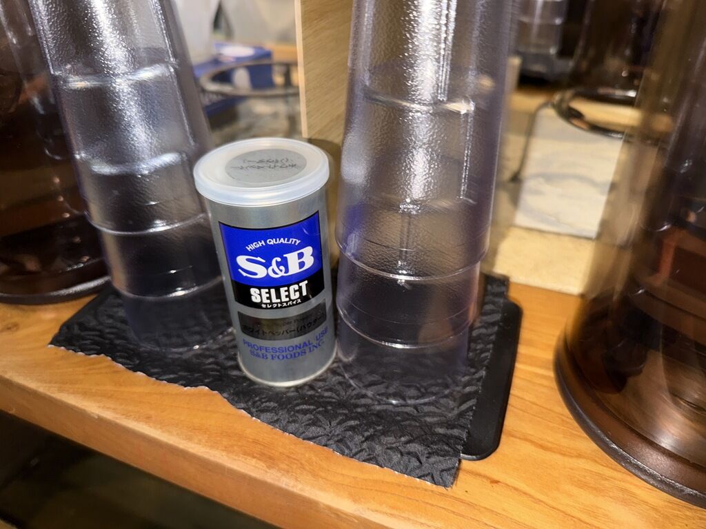 箸は割り箸。卓上調味料はS&Bホワイトペッパー。