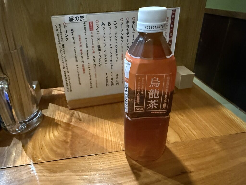 お冷代わりに冷たいウーロン茶ペットボトルが提供されます。