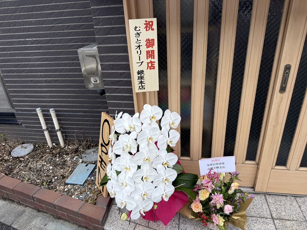 店頭開店祝花・胡蝶蘭は、麦とオリーブ 銀座本店、三河屋製麺、他から。