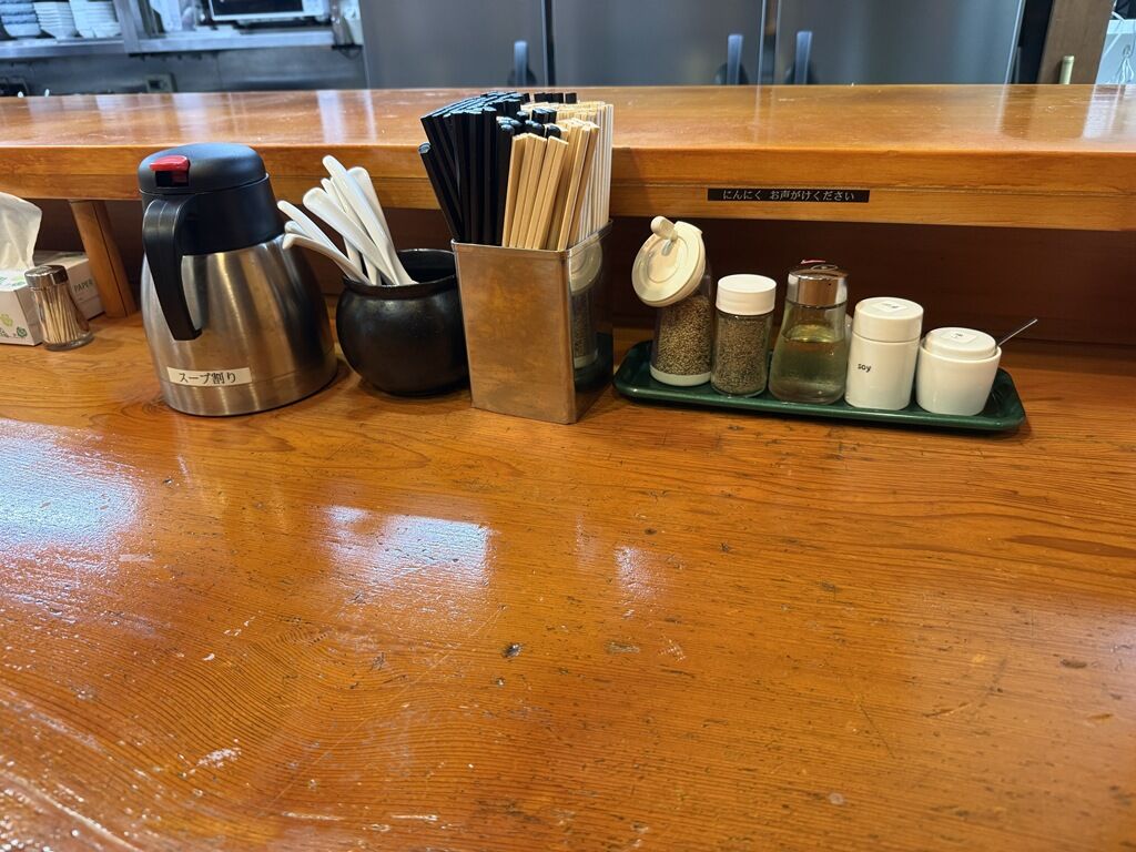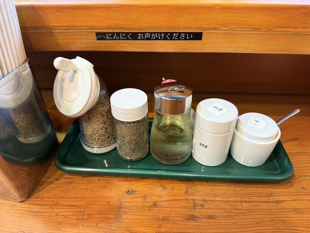 BGMは東京FM。箸は洗い箸でサスティナブルに配慮。卓上調味料はすり胡麻、ブラックペッパー、酢、しょう油、ラー油。にんにくは申告制。