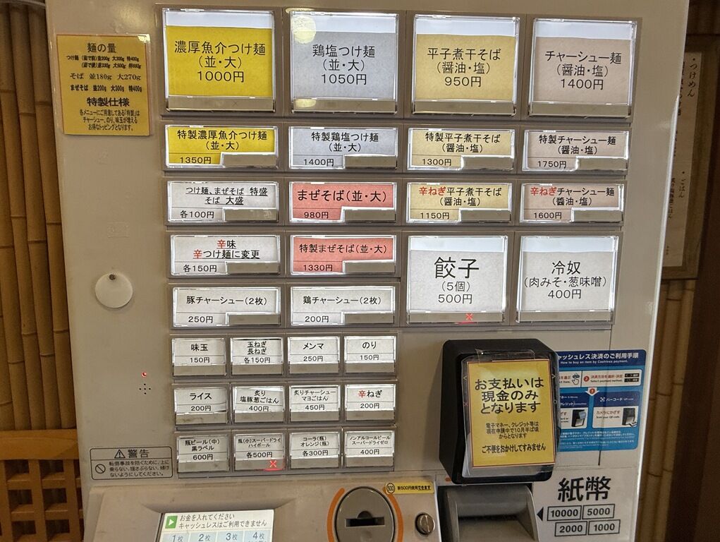 入店するとまず高額紙幣・新紙幣対応券売機で食券購入です。なお、現在は現金のみ使用可で、キャッシュレスは10月半ば頃対応予定。