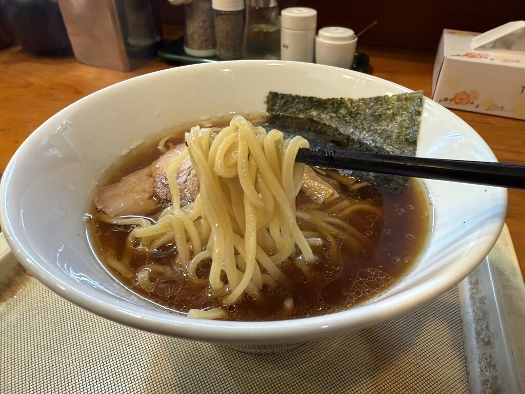 麺は三河屋製麺製のストレート中太タイプ。プリッとしたコシのある食感。柔らかいスープに対してやや麺が強い印象ですが、悪くはありません。
