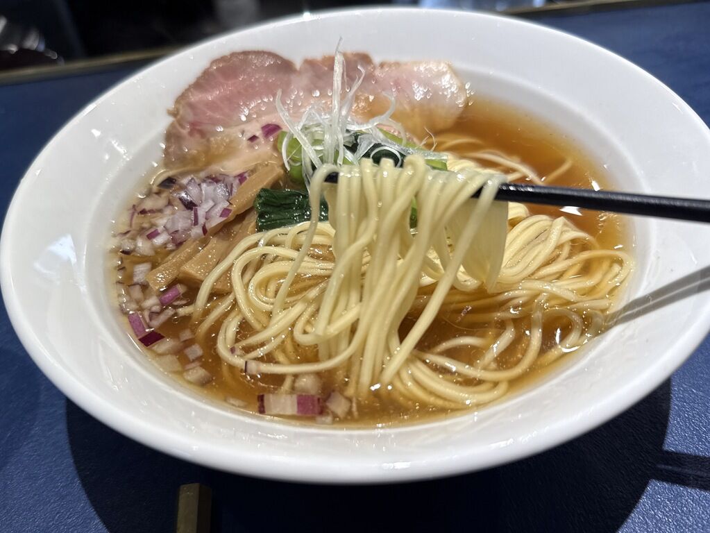 スープはさらさらの清湯醤油味。「ブランド丸鶏と背ガラ、ゲンコツ、様々な野菜を低温からじっくり煮出したスープ」、「白醤油をベースに全国から取り寄せた3種類の醤油をブレンドした和を感じる一杯」とのことで、あっさりながら芳醇なうま味溢れる味わい。トリュフ的な(もしかしたらポルチーニ?)少し特徴的な香りがあり、それが和というより洋風な風味に感じられます。淡麗清湯醤油というポピュラーなカテゴリーながらオリジナリティを感じる味でとっても美味しい!