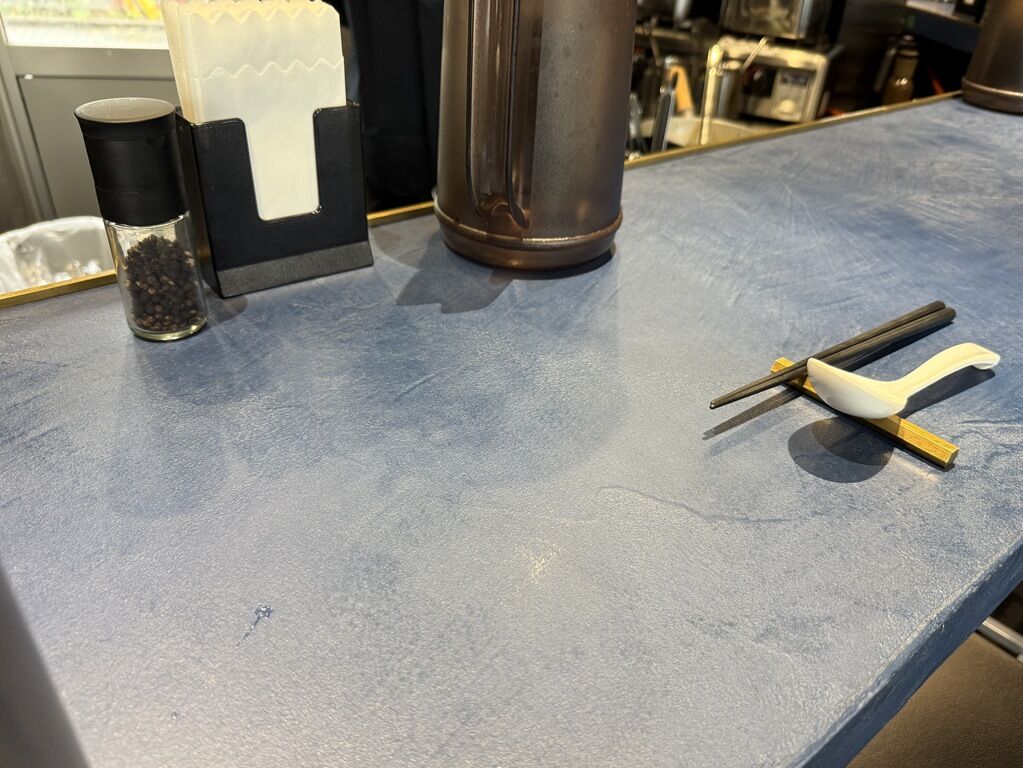 店内は厨房を囲む角度が急なへの字型カウンター7席(5・2)。カウンターはこだわりのモールテックス加工による碧色。屋号「金碧」の由来は、黄金のスープと蒼いカウンターから命名。