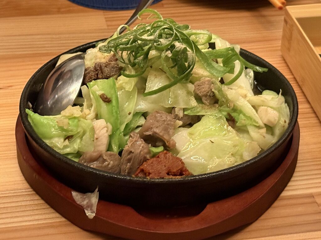 「牛すじと豚ハラミのスタミナ鉄板炒め」。福岡のご当地グルメ「スタミナ鉄板」、ニンニクが効いてます。これを豚骨ラーメンにトッピングしたメニューが、「そらのいろ 西葛西店」の「特製スタミナラーメン」。