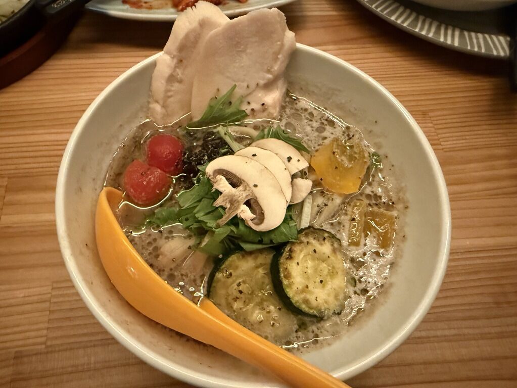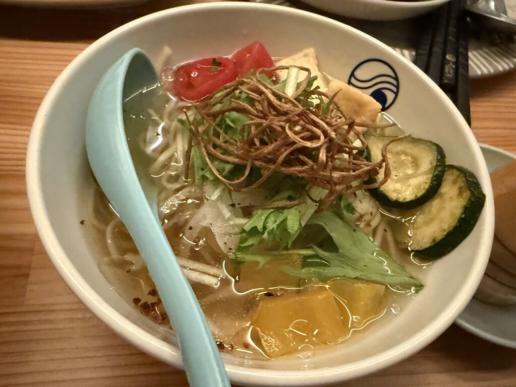 「Vegan塩そば(ハーフ)」、「味が足りなかったらかけて下さい」とミル入りソルトが提供されます。薄味の塩味で、確かに濃い味のつまみばかり食べた後だと少し物足りなく感じるかも。あっさりすっきり淡麗で洗練された味。