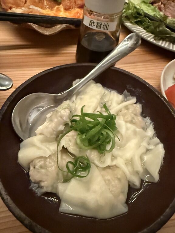 「そらのいろ名物 水餃子」、一緒に酢醤油ボトルが提供されます。