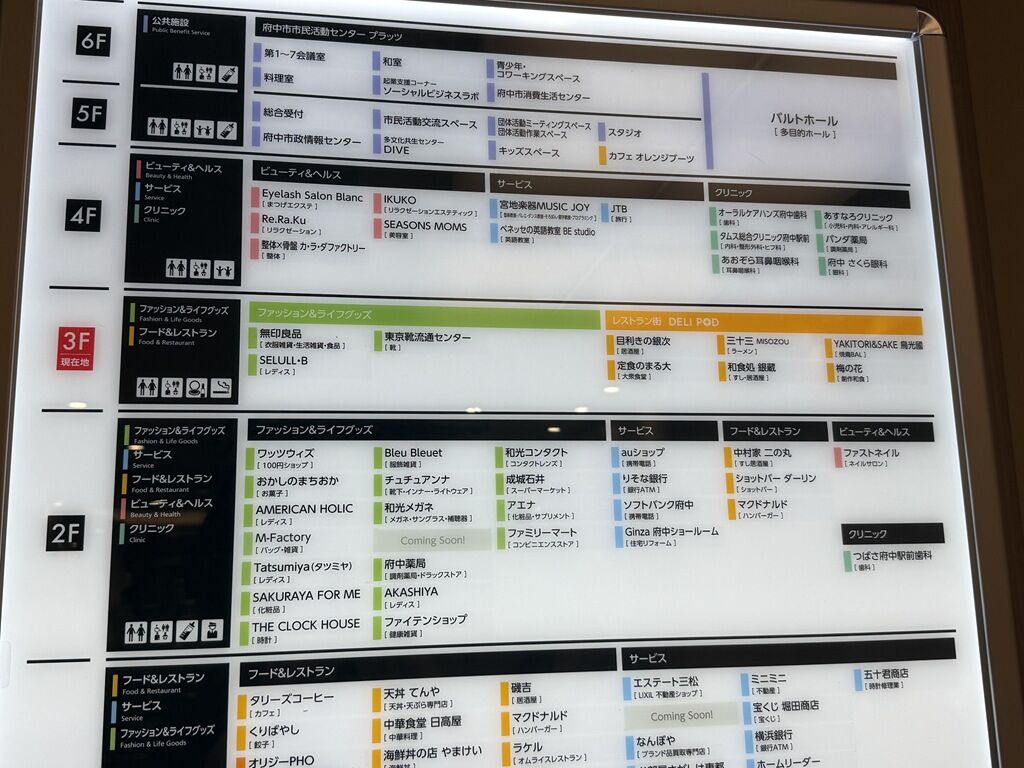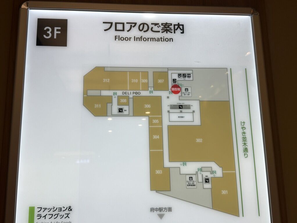 店の場所は、府中駅南口徒歩約1分。府中駅とスカイデッキでビル2Fが直結の商業ビル「ル・シーニュ」3Fレストランフロア308区画。エスカレーターやエレベーターからはちょっと奥まった場所。「栗歩と芋こ」の跡地。