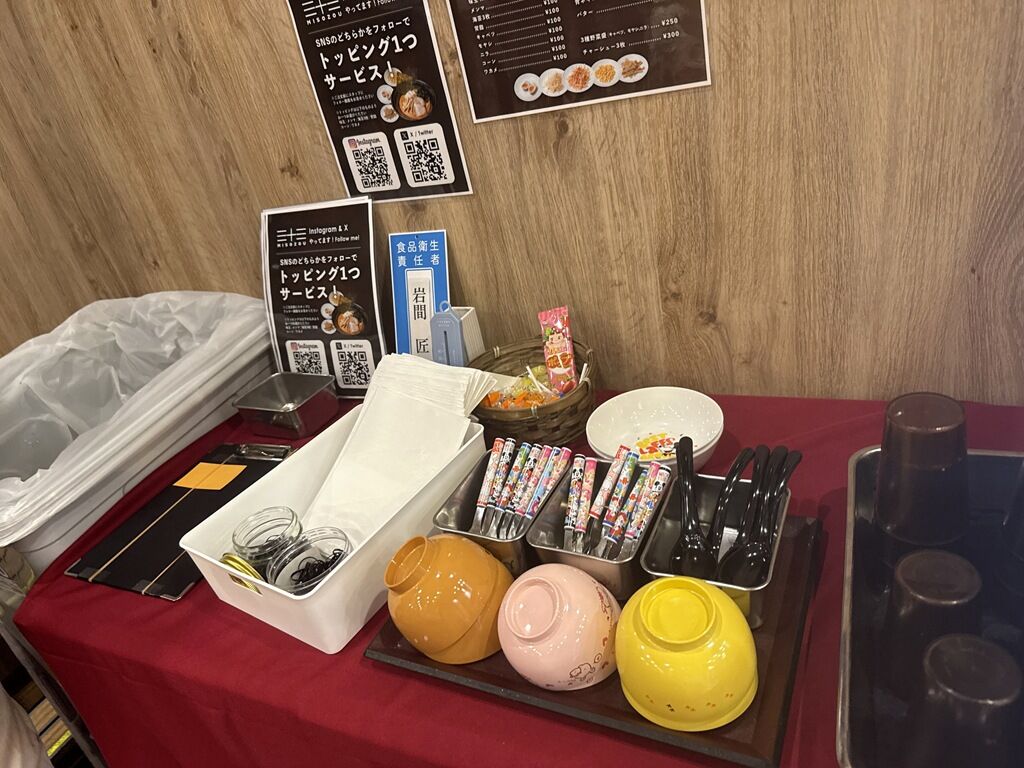 BGMはポップス。箸は割り箸。カウンター下の棚に箱テッシュ。紙エプロン・ヘアゴム・キッズ用食器は券売機横の机にあります。