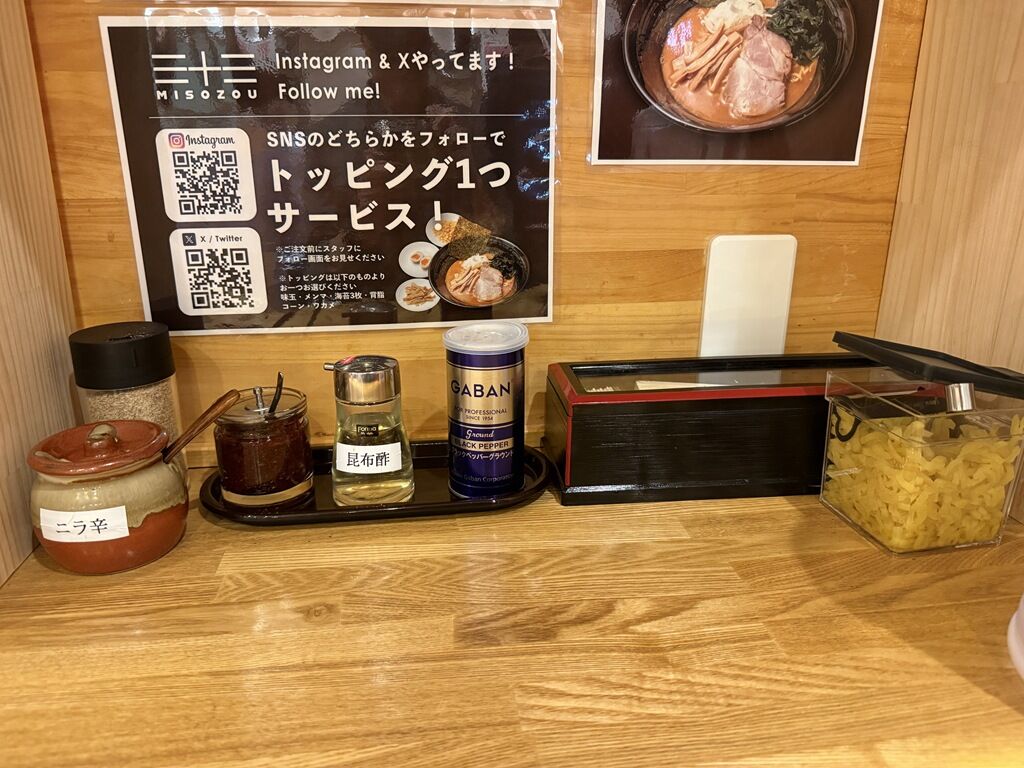 卓上調味料・薬味は、摺り白胡麻、ニラ辛、辛味噌、GABANブラックペッパー、龍馬たくあん。