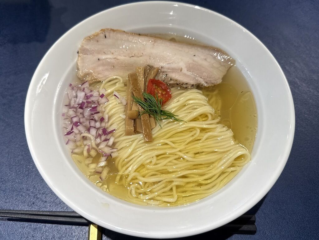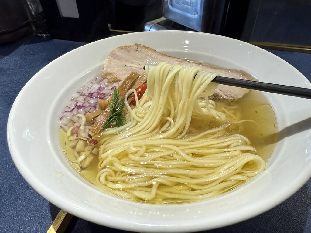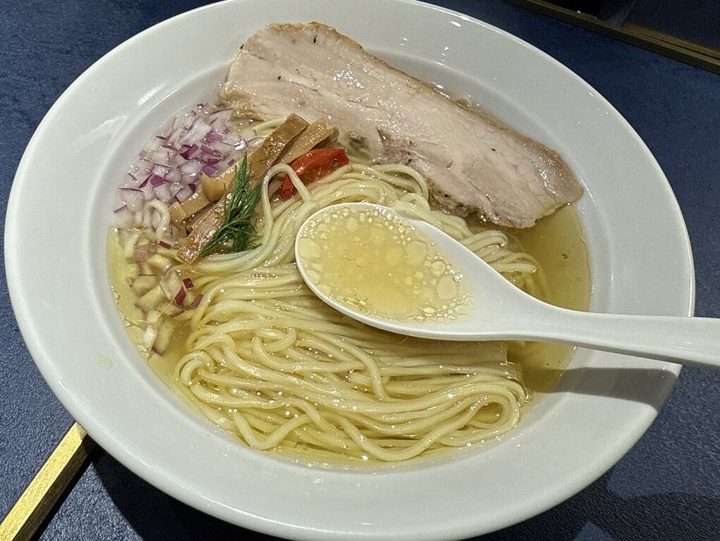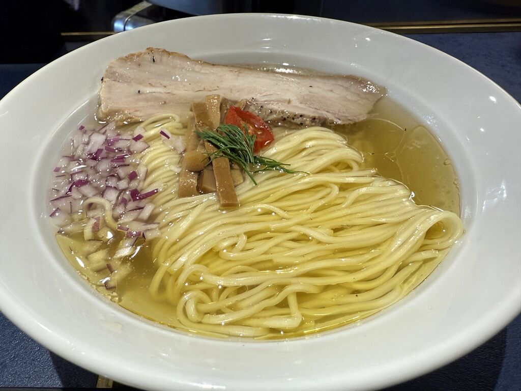 スープはさらさらの清湯塩味。ブランド鶏や豚骨、ムール貝、野菜、キノコ等の出汁。塩ダレは、フランスグランドとカマルグ地方の完全天日塩メインに2種ブレンド。加えてブルゴーニュの白ワインシャブリを使用。醤油よりも鶏や貝の輪郭が鮮明になり、またワイン効果とキノコの作用かさらに洋風化が加速。うま味が凝集された上質上品ながら深みのあるコンソメの様なスープでとっても美味しい!