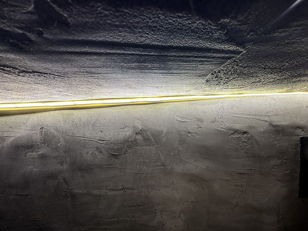 厨房にはイケメン店主さんx2。1ロット3杯、流れる様なオペレーションで進行。カウンター下から足元を明るくライトアップ。