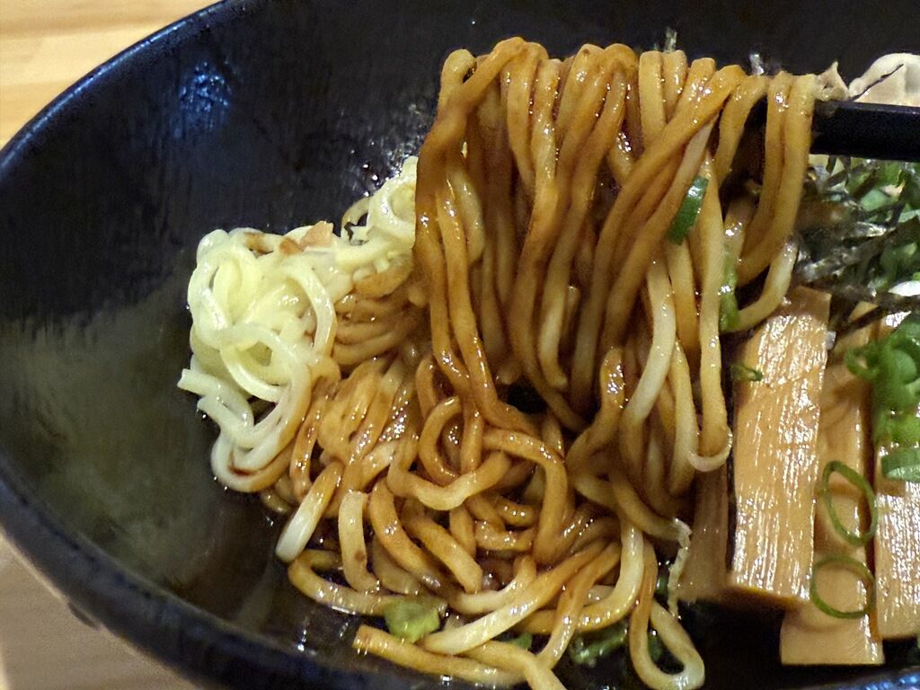 麺は平打のほぼストレート中太タイプ。ツルシコでズバズバ啜れる喉越しの良いもの。油そばの麺としてはとても良く合っています。