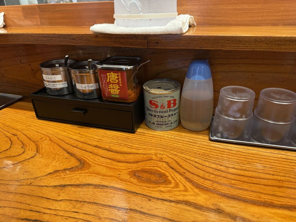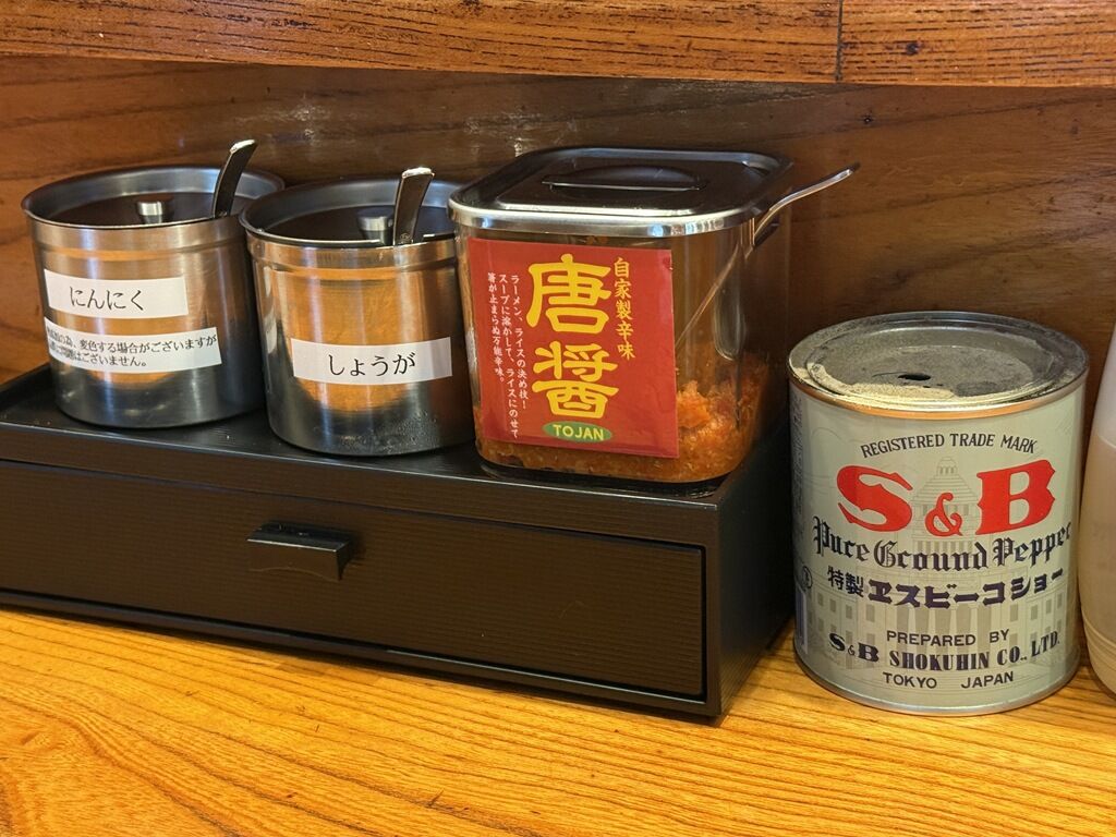 BGMはカントリーアンドウエスタン♪箸は割り箸。卓上調味料は、おろしにんにく、おろし生姜、自家製辛味 唐醤。