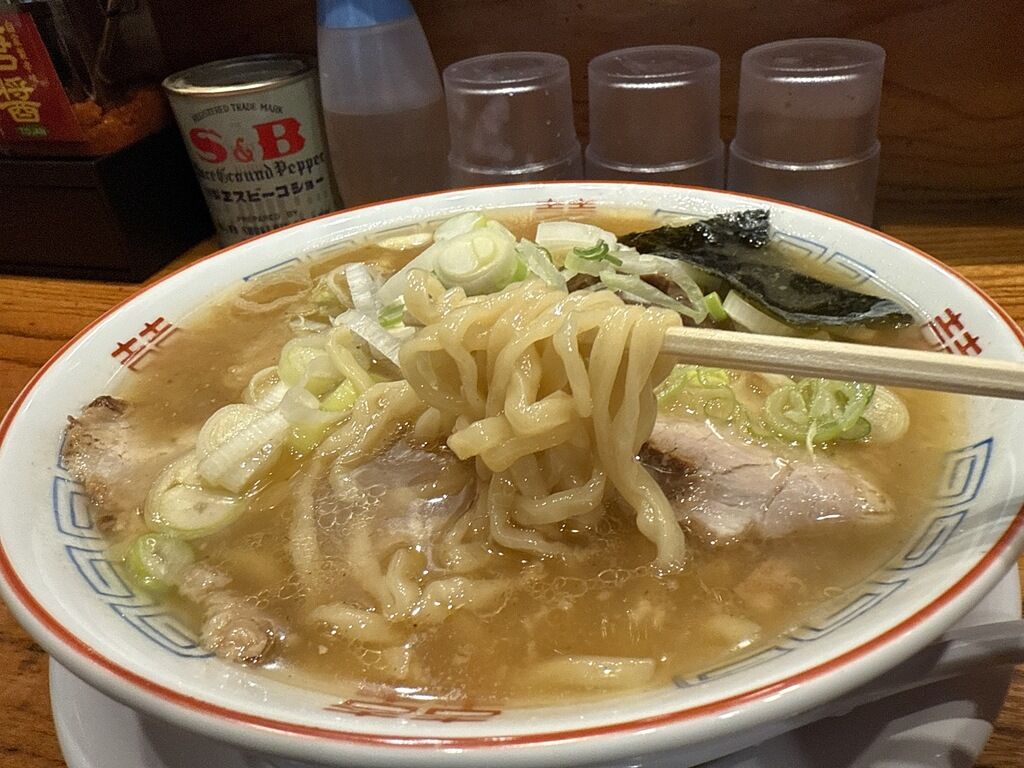 スープはさらさらで濁りのある醤油味。丼の縁近くまでなみなみと入って、熱々での提供。動物・魚介の複雑で深みのある味わい。切りたてチャーシュー、アツアツなみなみスープ、チャーシュー多めなど、ちゃん系と似ている点もありますが、スープの色味や味は別物。玉グループでは「マルショーラーメン」がパッケージングは似てますが、味はやはり異なります。ネオノスな造作にして惹きが強く、あと一口がやめられない止まらない旨さがあってとても美味しい!