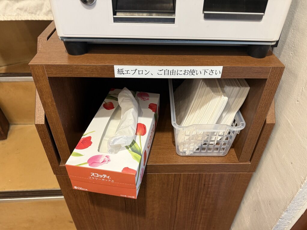 厨房に店長さんと助手さんの2オペ体制。紙エプロン、箱テッシュは券売機下の棚にあります。
