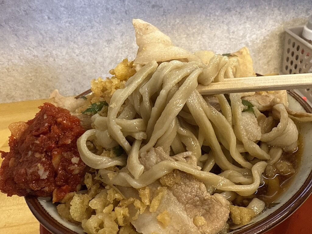 自家製の麺は太縮れタイプ。ゴワゴワのあごで喰らう剛麺。大量の肉と一緒に頬張ると至福です。