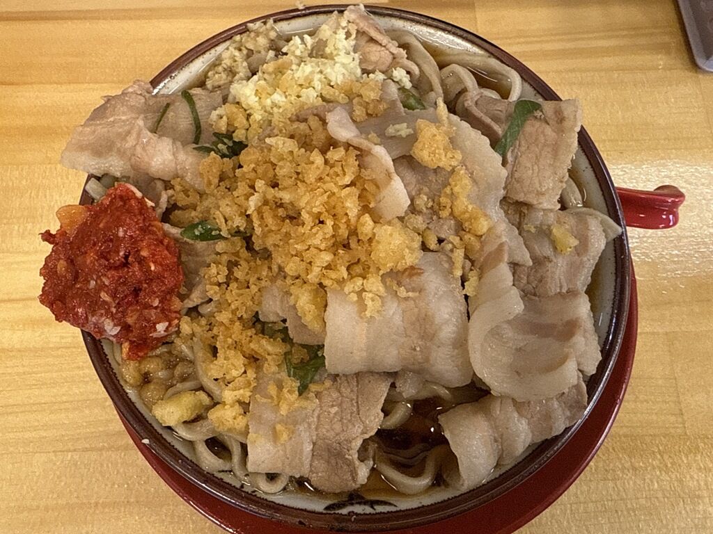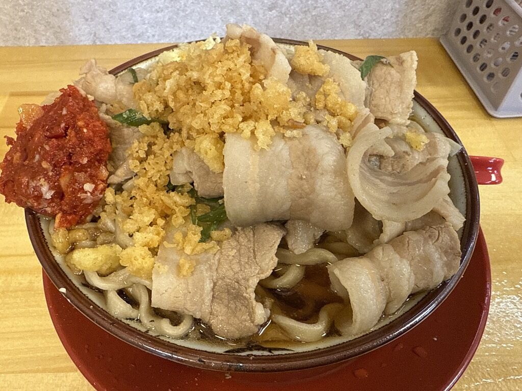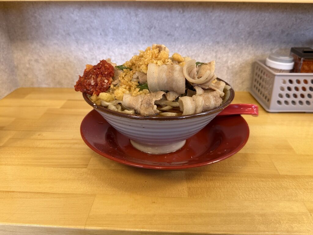 具はたっぷりの豚バラ肉、ねぎ、無料トッピングの天かす、カラミ、ショウガ。盛り付けは本家よりも量が多めで豪快・ダイナミック。