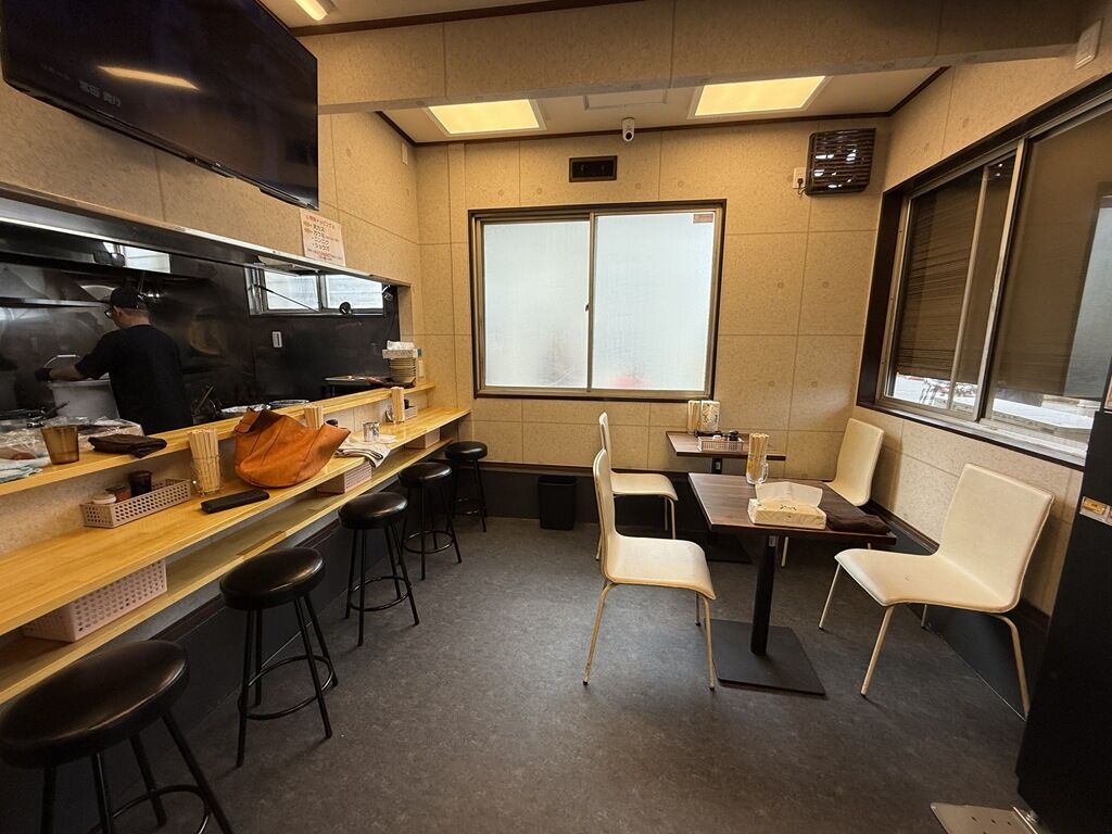 店内は厨房前に真っ直ぐなカウンター7席、2人卓x2。