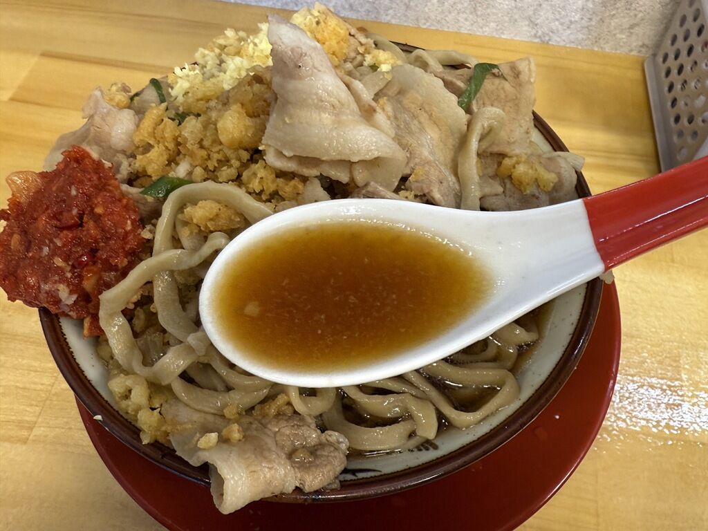 スープはさらさらの清湯醤油味。ちばから醤油にカネシみりん使用、鰹出汁の和風仕立て。本家よりあっさりと優しくおとなしい味に感じて何だろうと思いましたが、本家と画像を見比べて合点。「NO11」の方が圧倒的に肉が多く盛りが良くてボリューム満点。ですが、その分天かすがやや少なく更に天かすがスープと混ざりずらく、スープに油分が行き渡らず、あっさりに感じてしまったかと。天カス自体オプションですが、ありの場合は本家並みにどっさり入れるか、食べ手側もなるべく天地返しするなどしないと、本家と味が変わったように思えちゃうんです。まあ油脂は置いといて、それ以外は本家「肉そば」よりもさらに量感と破壊力がアップして、とっても美味しい!
