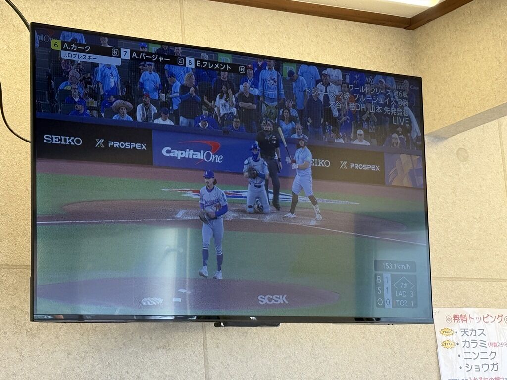 カウンター上のモニターにワールドシリーズの生中継映像。ですが、音は絞られています。