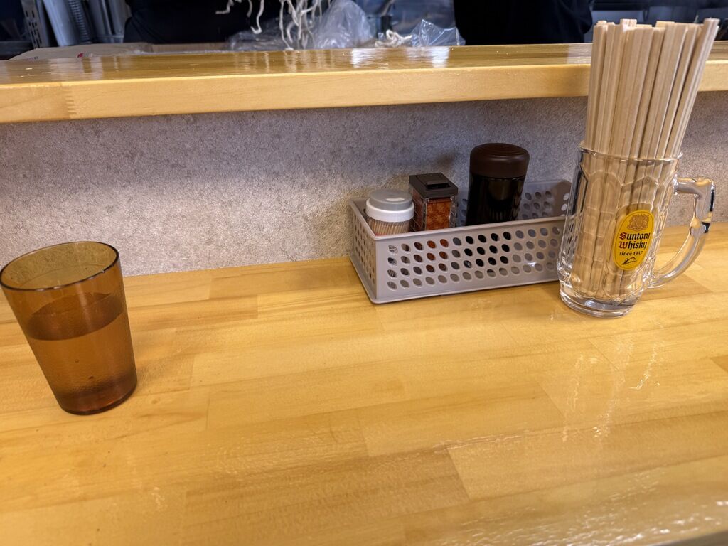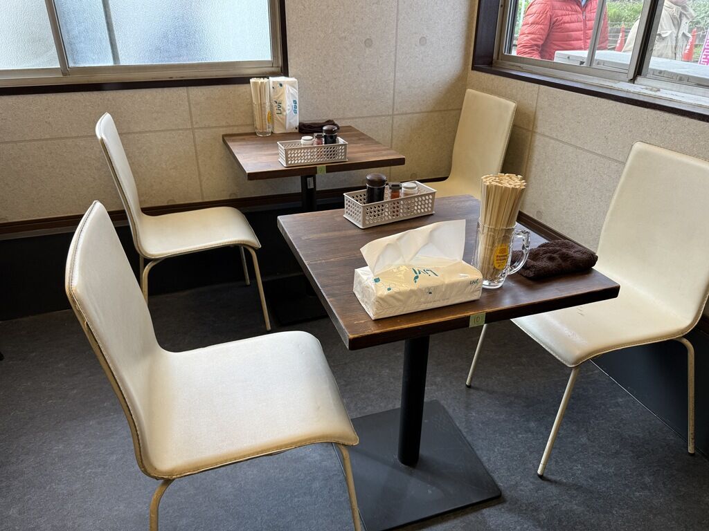 BGMはJ-POP。箸は割り箸。卓上調味料は一味唐辛子、カラメ用のタレ。