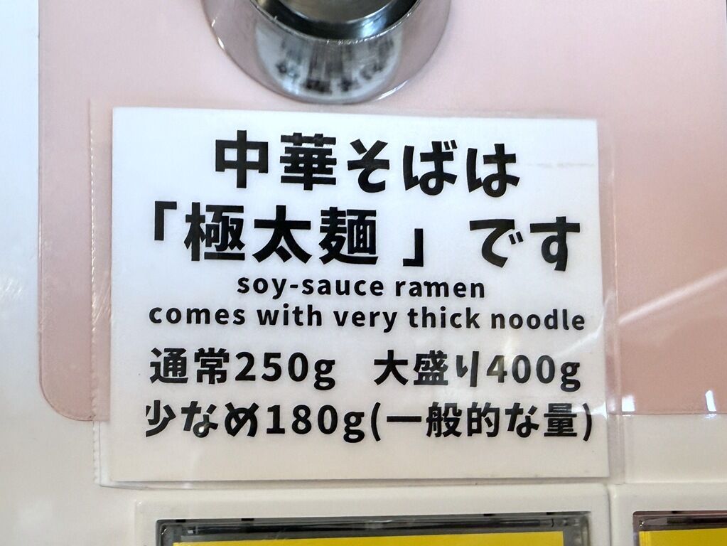 麺量は通常250g、少なめ180g、大盛り400g+100円。少なめは券売機ではなく、食券渡すときに口頭で申告制。