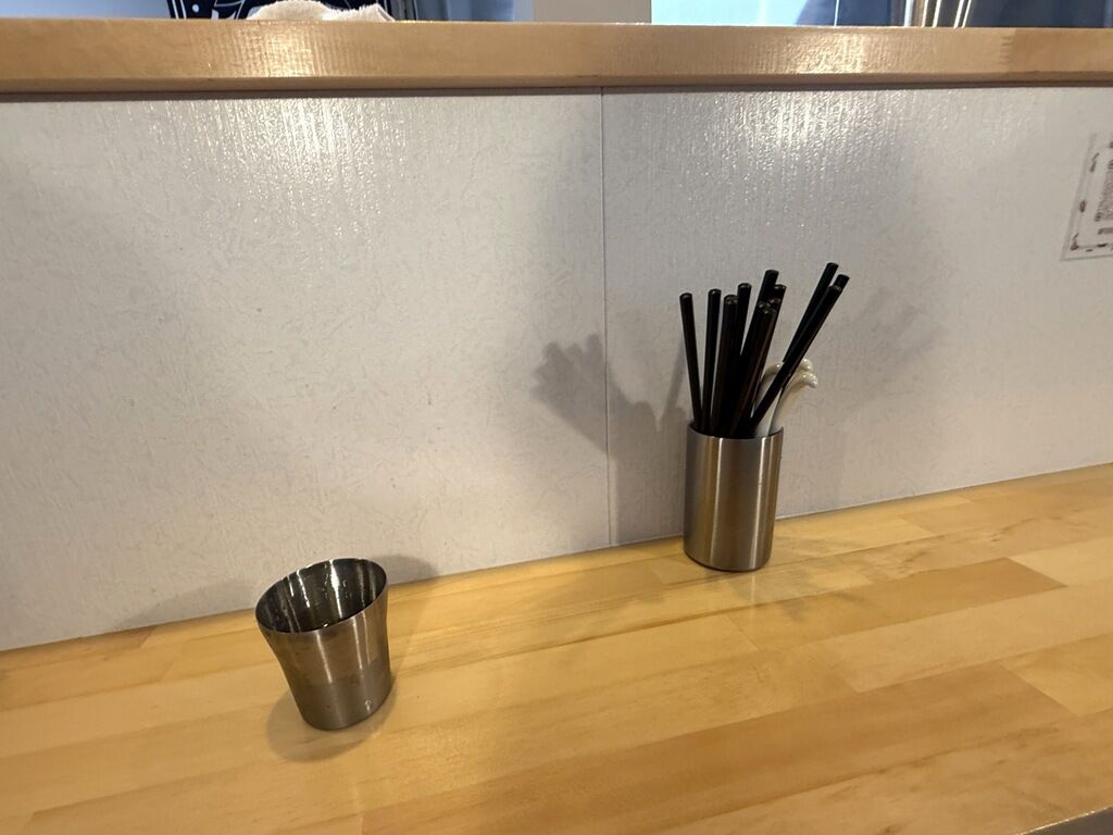 厨房に店主さんと助手の男性、接客の女性の3銘体制。BGMはヒップホップ。箸は洗い箸でサスティナブルに配慮。