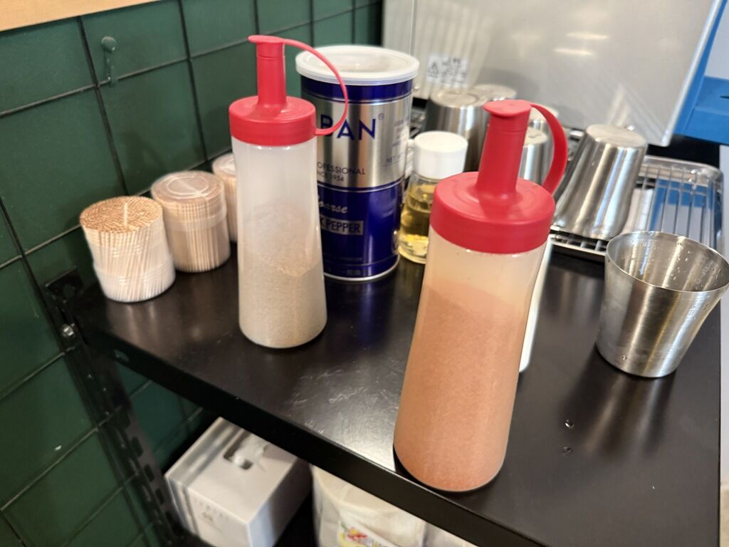上調味料は無しですが、奥給水器そばに、GABANブラックペッパー、白胡椒、酢、一味唐辛子、酢があります。