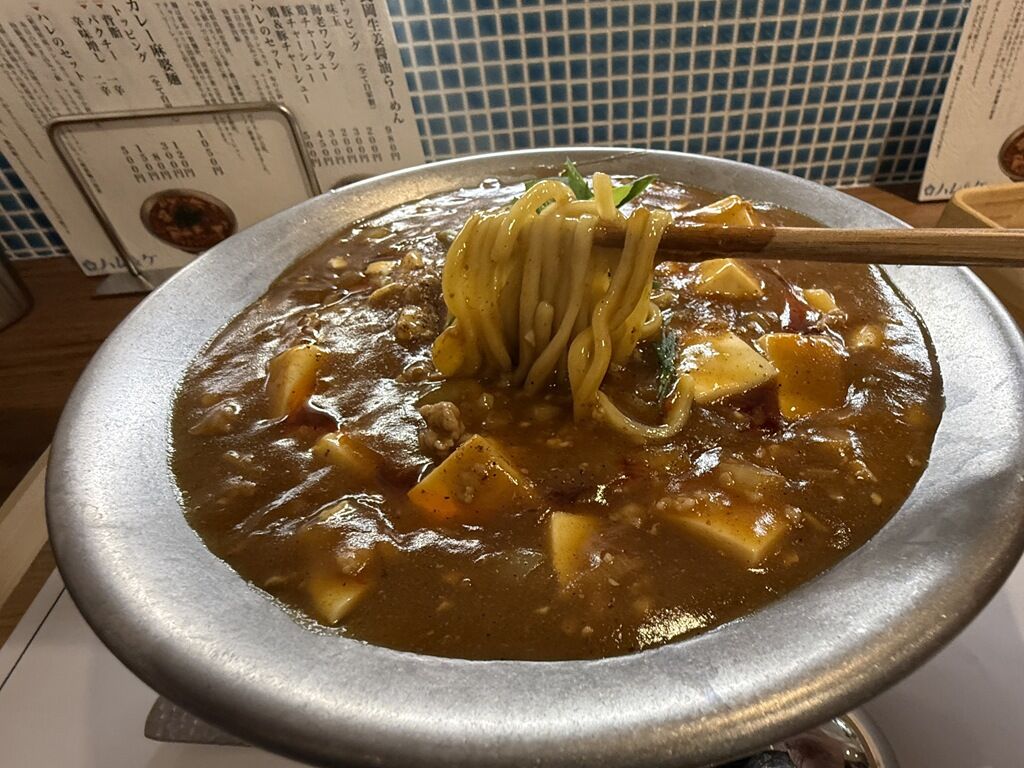 麺はほぼストレート中太タイプ。もちもち食感が麻婆カレーとがっちり好相性。