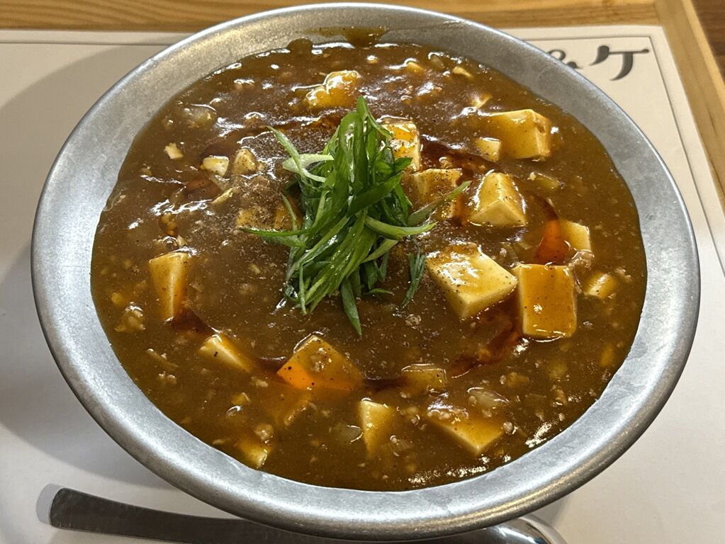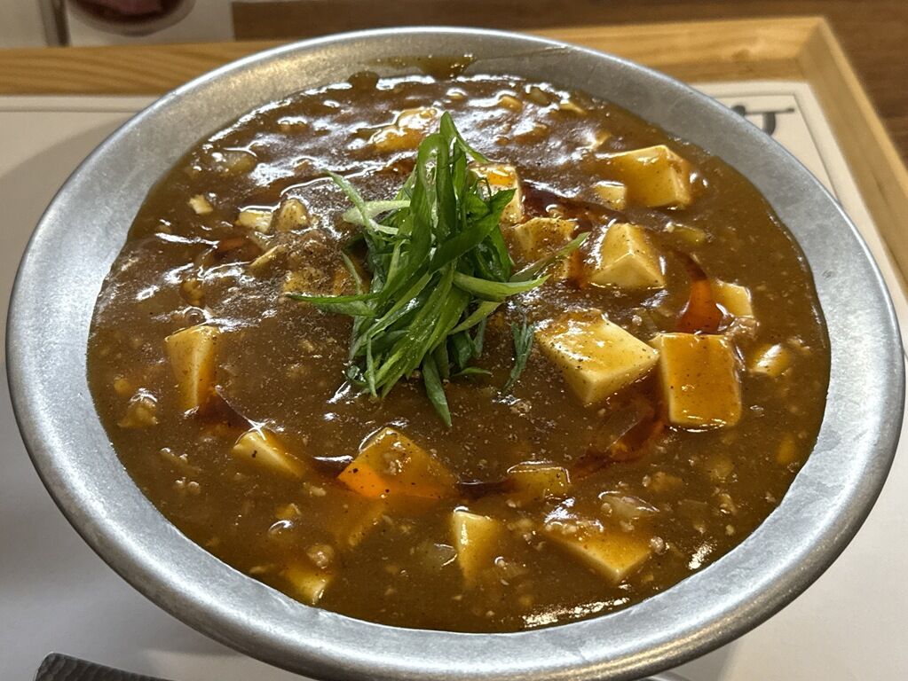 「カレー麻婆麺」店内連食。三条カレーラーメンがベースで、新潟ラーメンのニューウェーブ「麻婆麺」.のエッセンスを加えたもの。