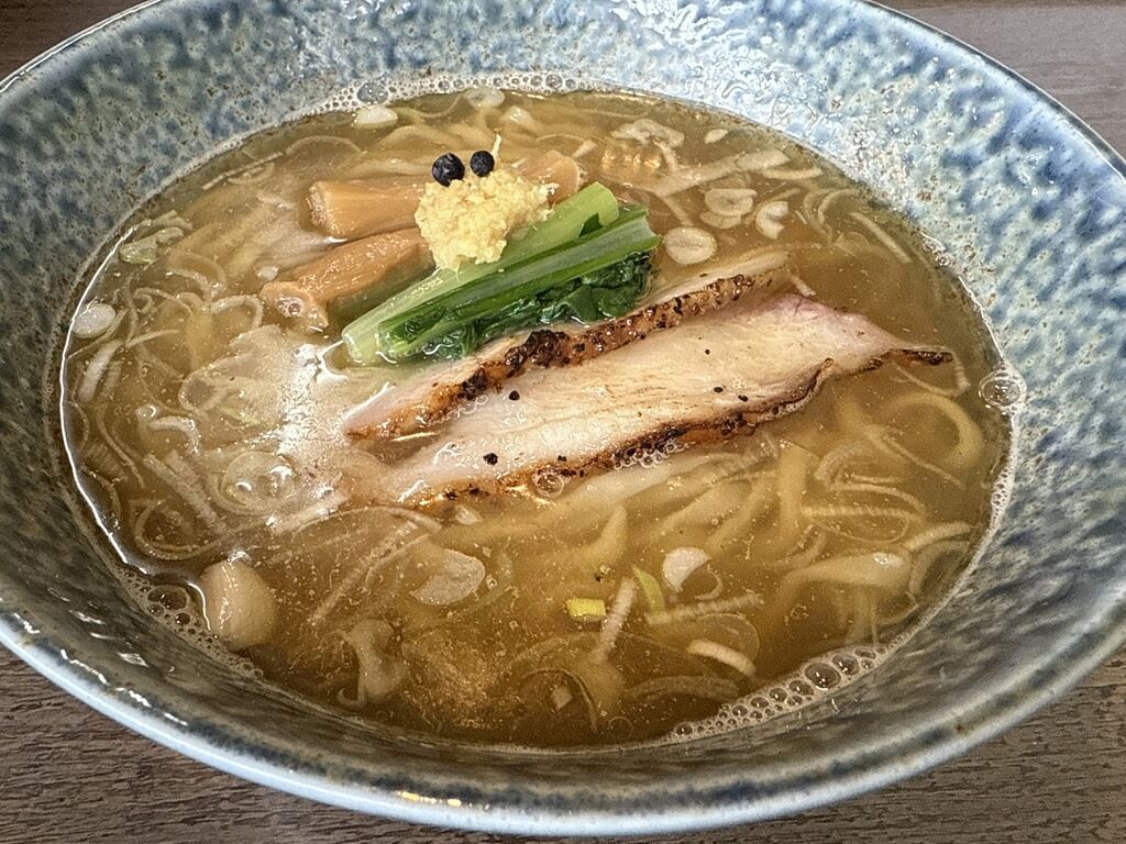 具はチャーシュー、青菜、材木型めんま、きざみねぎ、中央にこんもりとおろし生姜、その上に生黒胡椒2粒。多分正しい置き方はメンマ、青菜が手前でチャーシューが奥。そうすると黒い目玉の生姜のおばけがこっちを向いてる感じになるかと。自分はカウンター上から丼を下ろすとき、無意識にチャーシューを手前側になるように置く癖があって、多分逆向きに置いちゃった感じです。麺目ないm(_ _)m
