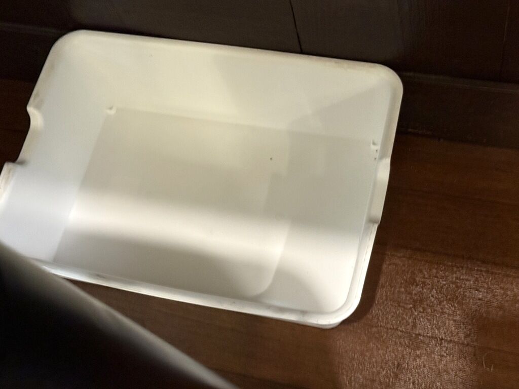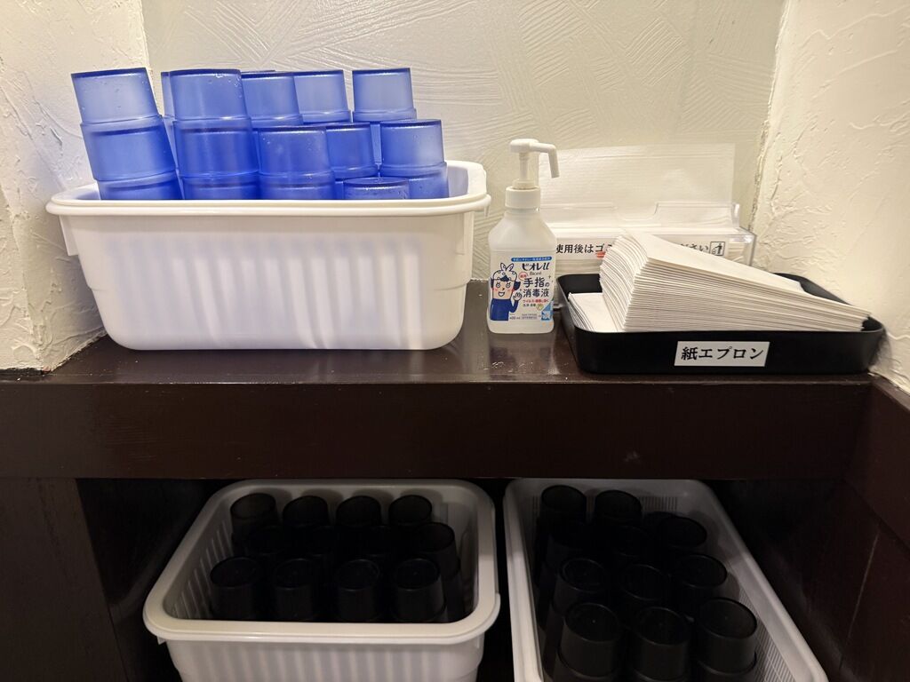 厨房に店主さんと助手さん2オペ体制。足元に荷物かご常備。紙エプロン、箱ティッシュは給水機横からセルフでゲット。