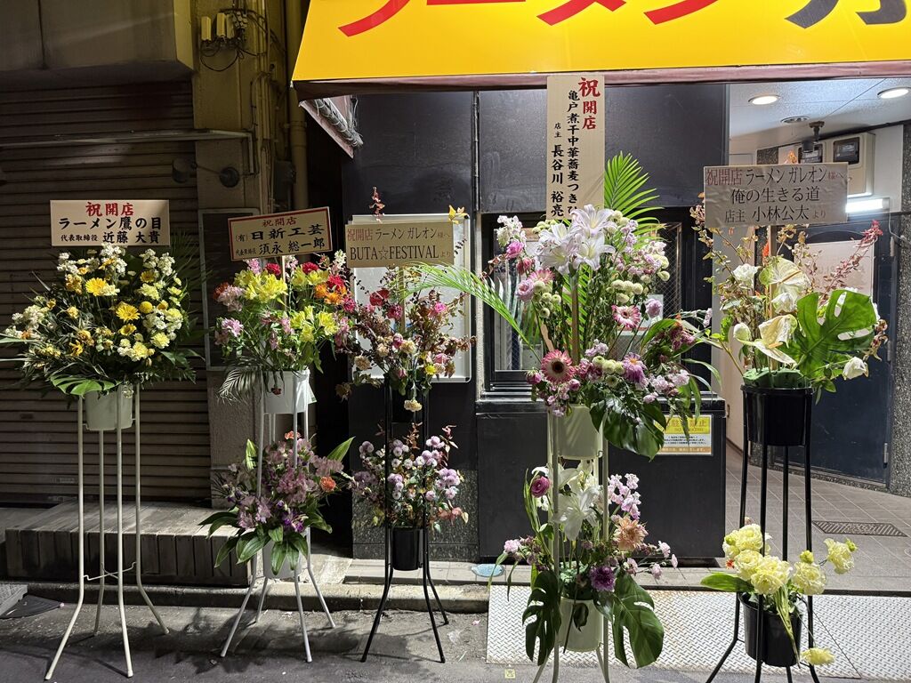 「ガレオン」の開店祝花は、俺の生きる道、亀戸煮干中華蕎麦つきひ、BUTA☆FESTIVAL、ラーメン鷹の目、他から。