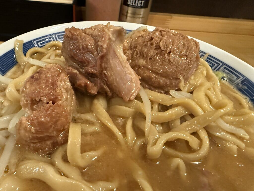 具は巨大な肉塊のブタ3個、ヤサイ、しょうが、アブラ少々。ブタは箸で簡単に切れるほどで、二郎系のブタとしては圧巻の柔らかさ。