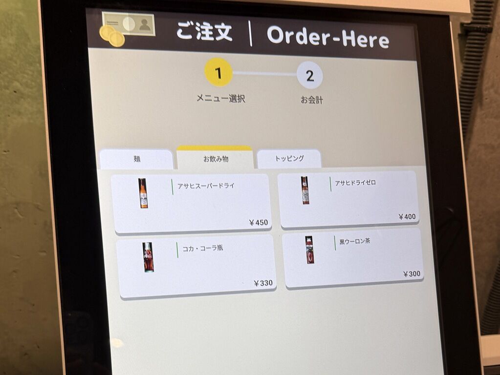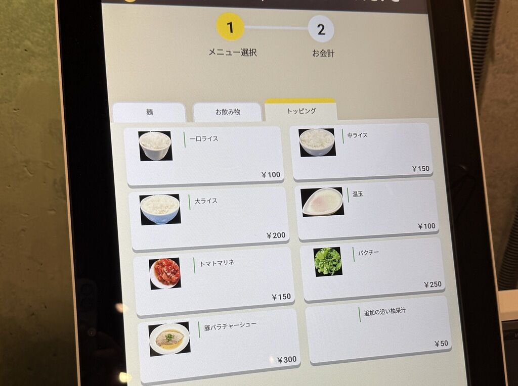 入店するとまずタッチパネル式券売機で食券購入です。なお決済方式は現金使用不可、キャッシュレスオンリー。