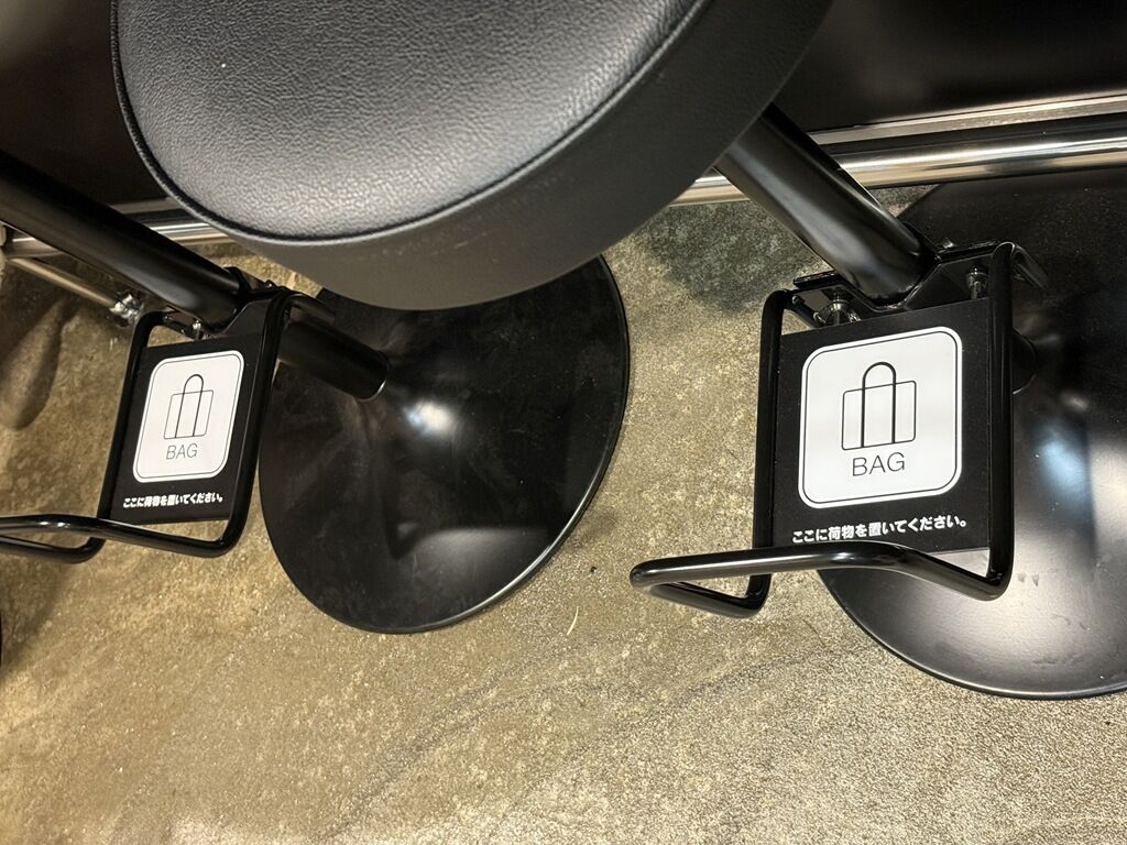 椅子の柱脚後ろに小さい荷物を載せることが出来るようになっています。紙エプロンは券売機横からセルフで取得。
