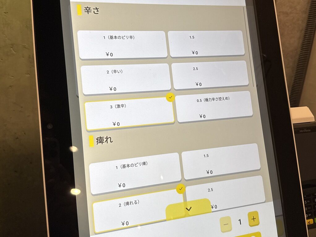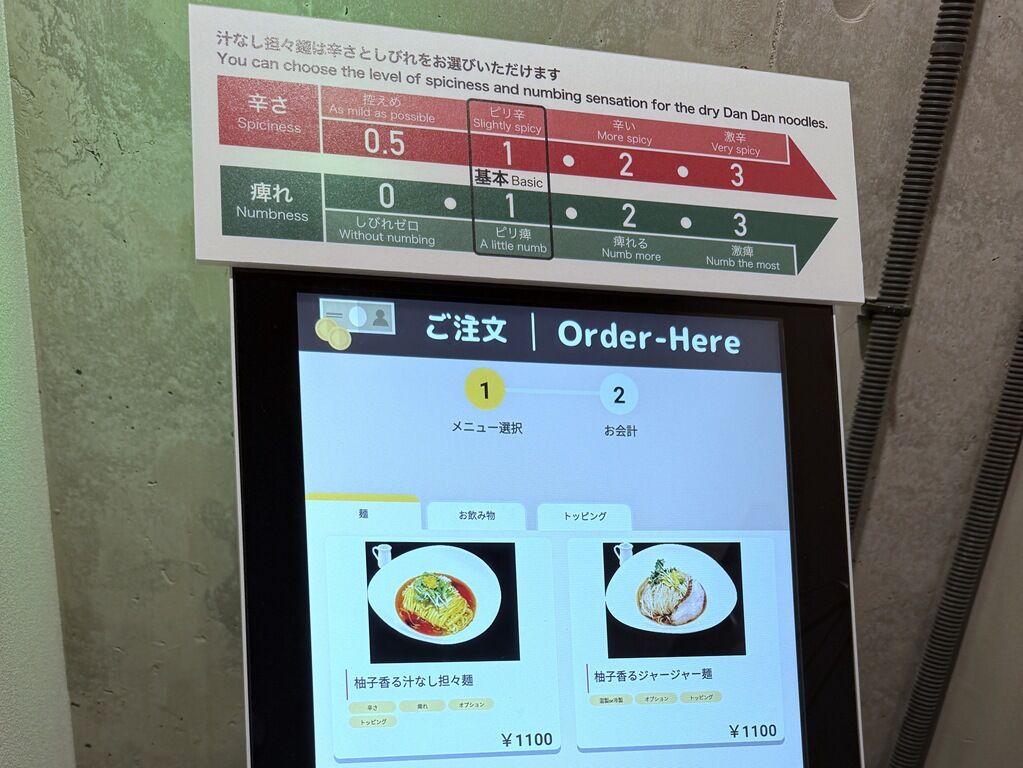 「汁なし担々麺」は、券売機で辛さと痺れをそれぞれ、辛さ05(控えめ)~3(激辛)、痺れ0~3(激痺)の05刻みで指定可能。辛さ・痺れMAXでも同料金。辛さ3はジョロキアパウダー使用とのことです。