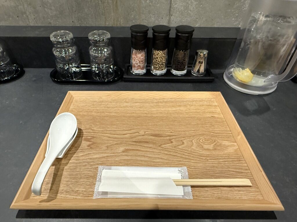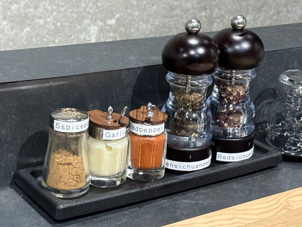 BGMはジャズ。箸は割り箸。卓上調味料はピンク岩塩、ホワイトペッパー、ブラックペッパー、五香紛、おろしニンニク、一味唐辛子、山椒、ミックス唐辛子(ホール)。