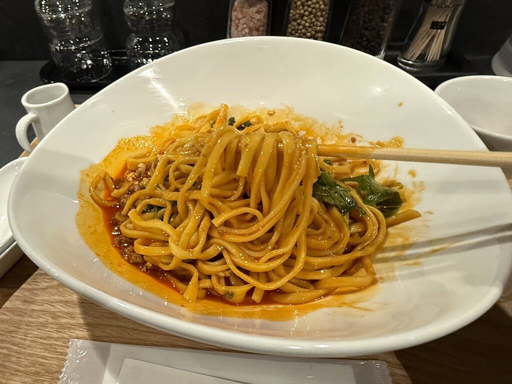 三河屋製麺製の麺は平打ちストレート太麺。ツルっとシコシコ、ムッチリとした強いコシとハリのある食感。柚子が鮮烈に効いた担々ソースと肉味噌が、存在感抜群の麺に絡んですごく美味しい!