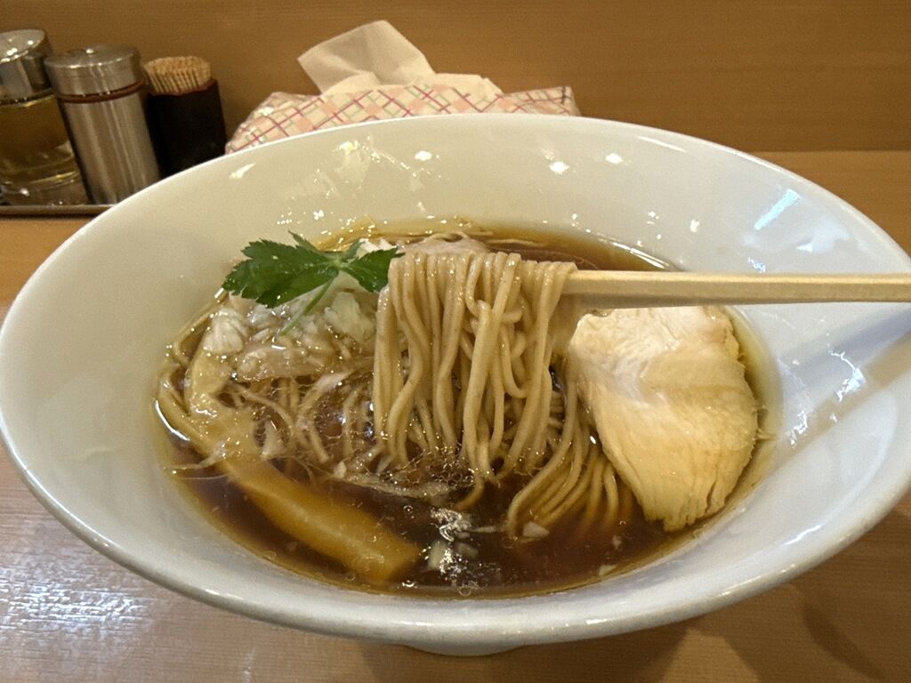 スープはさらさらの清湯醤油味。鴨と大山鶏を炊いた鶏清湯。水鶏のまたおまというか、巷間に溢れるお馴染みの味ですが、一世を風靡して支持されるだけのことはあってとても美味しい!