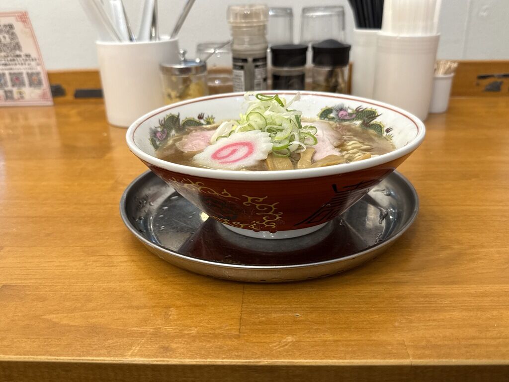 赤巻三ツ竜のトラディショナルなラーメン丼が銀の受皿に載って着丼。