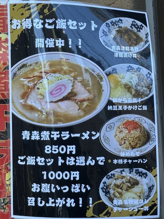 ご飯セットはラーメン+下記丼いずれか選択。デフォの「青森煮干ラーメン」のセットだと1000円と超お得。